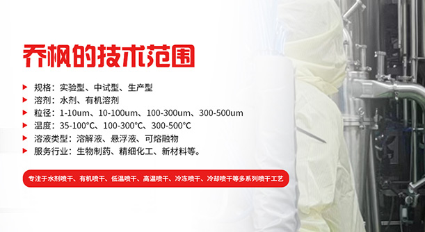 上海喬楓實業(yè)有限公司,成立于2012年,是從事噴霧干燥設(shè)備的研發(fā)設(shè)計、生產(chǎn)、銷售(小型噴霧干燥機(jī),實驗型噴霧干燥機(jī),35℃低溫噴霧干燥機(jī),有機(jī)溶劑噴霧干燥機(jī),低溫閉式循環(huán)噴霧干燥機(jī)、超細(xì)粉末噴霧干燥機(jī)噴霧冷凍干燥機(jī)、真空噴霧干燥機(jī)氣流噴霧干燥機(jī),噴霧造粒干燥機(jī),離心噴霧干燥機(jī),沸騰制粒機(jī)等)和售后于一體的綜合性公司,本公司現(xiàn)成為一家致力于為生物制藥、精細(xì)化工、新能源、陶瓷造粒及食品工程等領(lǐng)域提供全套解決方案的整線交鑰匙工程企業(yè)。